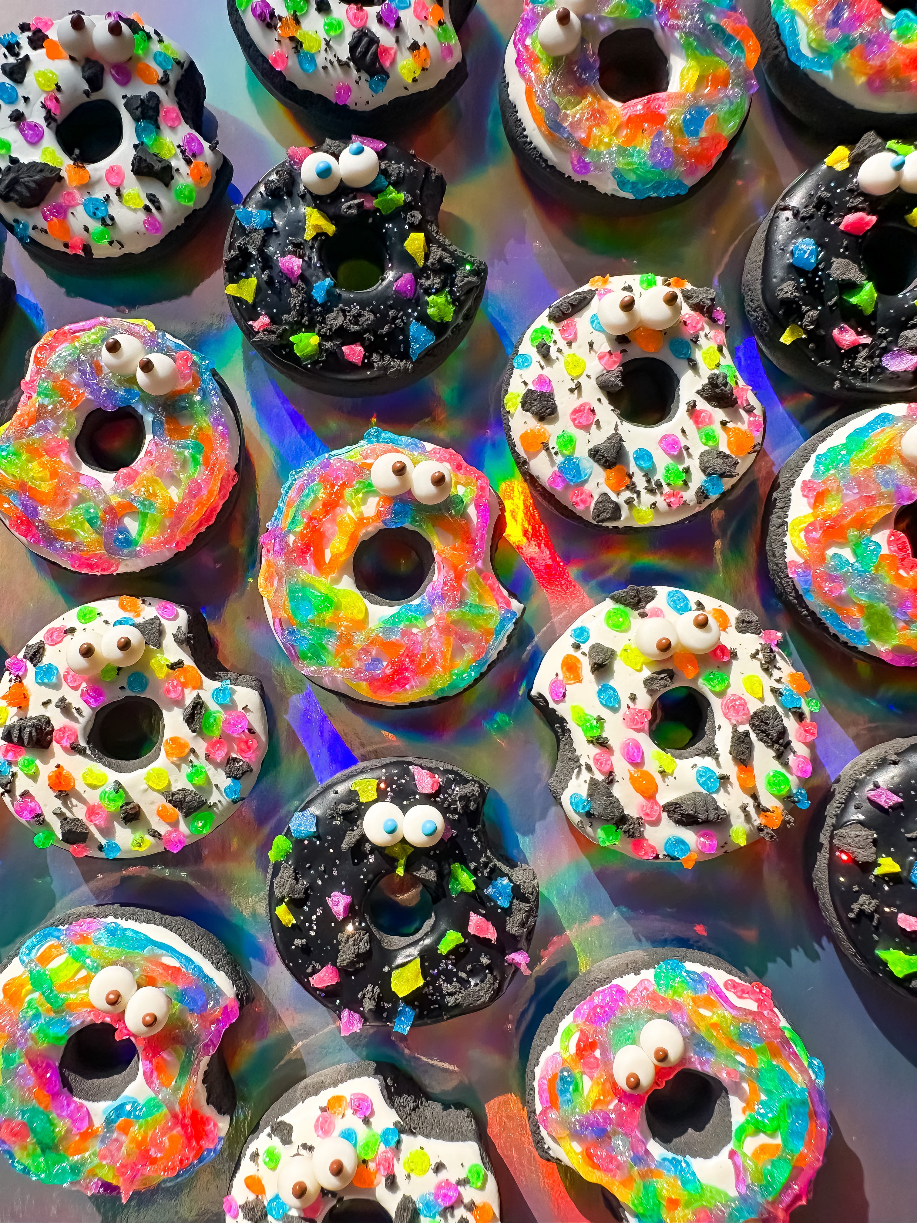 ブラックのドーナツ生地に、ネオンカラーの透明感のあるデコレーションが可愛い!